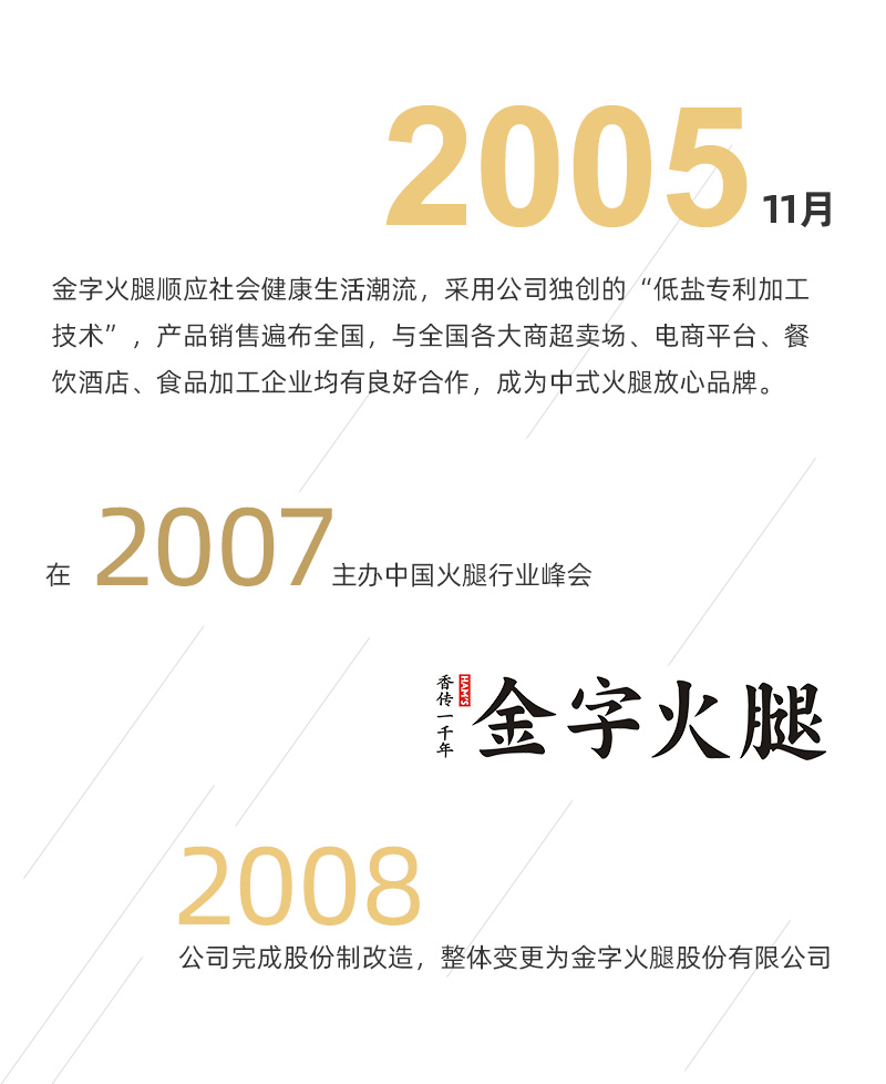 >金字火腿順應社會健康生活潮流,采用公司獨創的“低鹽專利加工技術”,產品銷售遍布全國,與全國各大商超賣場、電商平臺、餐飲酒店、食品加工企業均有良好合作,成為中式火腿放心品牌。