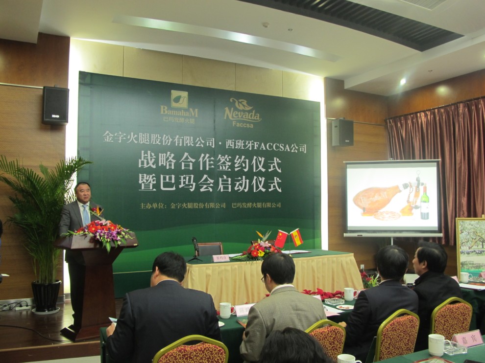 西班牙FACCSA公司負責人拉蒙先生在致辭中表示,發酵火腿在中國有巨大的市場空間,巴瑪火腿是中國發酵火腿的領軍品牌。雙方建立戰略合作關系,是企業發展需要,也是優勢互補的最佳選擇。今后,雙方要整合資源,加強交流,深化合作,努力把兩個企業的合作打造成中西兩國經貿合作的典范。