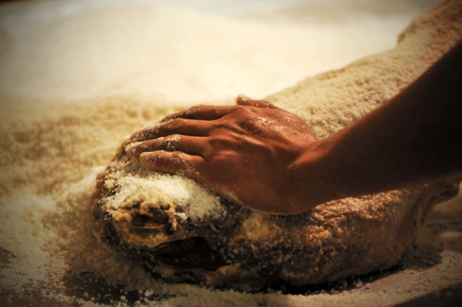 腌制火腿要使用大量的鹽,鹽并不是一次性倒入到火腿當中的,而是要將鹽均勻地涂抹到肉腿上面。涂也不是一次性就能涂抹好,每條腿可能都要經歷6—7次“美膚”和“按摩”的過程,最終表面結成白色的鹽霜,肌肉變得堅硬緊實了才算可以了。第一次抹鹽叫做“上小鹽”,就是先將薄鹽抹在豬腿的表面,然后腌制一晚。第二次抹鹽叫做“上大鹽”,是在“上小鹽”的次日,這次要先將腌制出的血水用手擠出,之后再均勻地涂上新的鹽。之后的上鹽均是在肉質比較肥厚和筋骨相連的地方著重補鹽,時間則是在第7天、第13天、第27天。經過這些次的鹽腌,整條豬腿均被食鹽腌透浸滿,腌的時候碼放也是有講究的,皮朝下肉朝上,最后一層則是皮朝上的。