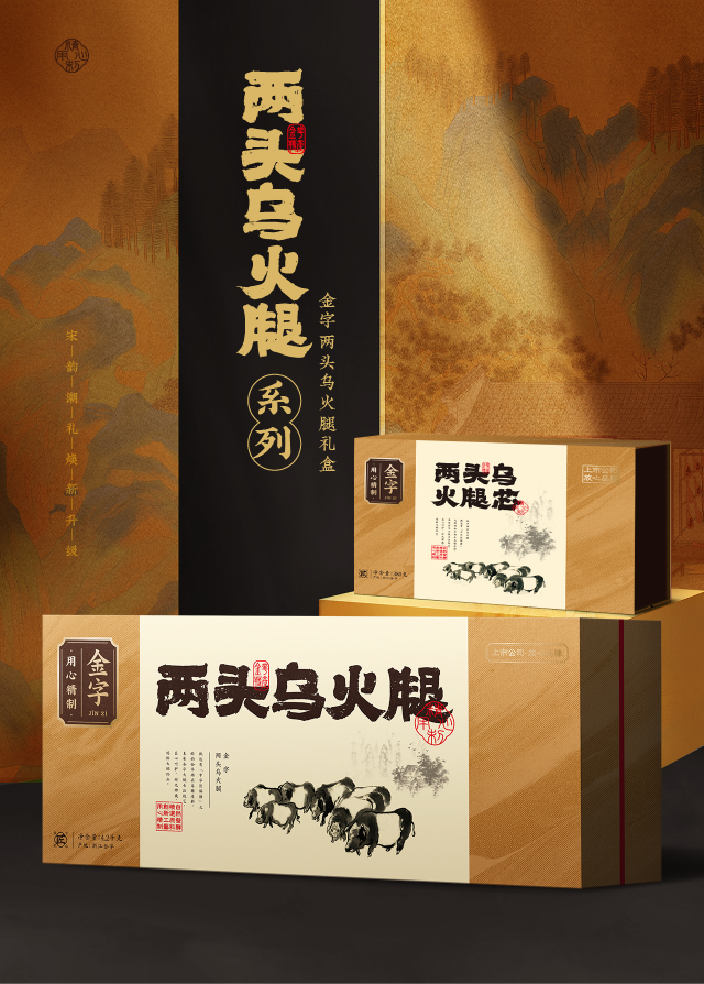 四大火腿系列:留香系列、陳香系列、典藏系列、兩頭烏系列,各自美麗又相輔相成。留香系列采用宋朝的天下第一色:紅色,喜慶、炙熱、勇猛;陳香系列采用宋鈞紅釉的朱色,低調(diào)、穩(wěn)重、靜謐;典藏系列和兩頭烏系列采用冷色調(diào):黑色、棕色,端莊、素雅、歸真。
